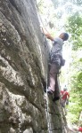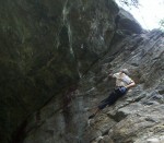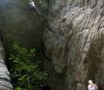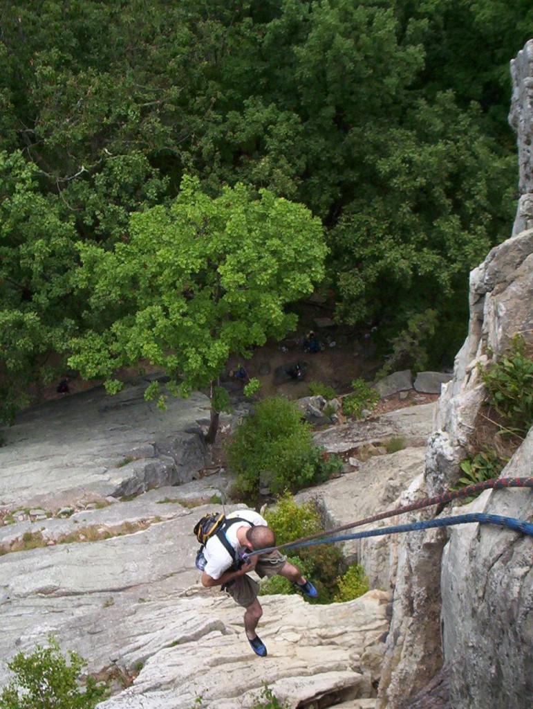 As I rapped, the hail, and the rain as well, kept coming down harder. The hail was about pea to marble sized, which hurt. The rope and I were soaked before I hit the intermediate rap station. When I took the rope out of my belay device I was shivering and jittery and I lost control of the ends. I could see the rope ends moving and knew Cathy was testing it to see if I was off but I didn’t want to call up to her to rappel until I a) regained control of the ends to at least give her a fireman’s and b) decided if she should really join me at this crazy, unprotected stance. I was thinking maybe I should duck into the side of the wall and wait it out there while she found cover in the trees but I couldn’t talk to her because of both the noise and the fact that turning my face up towards her meant getting smashed in the eye with hail. Thank God for helmets and for having them on.