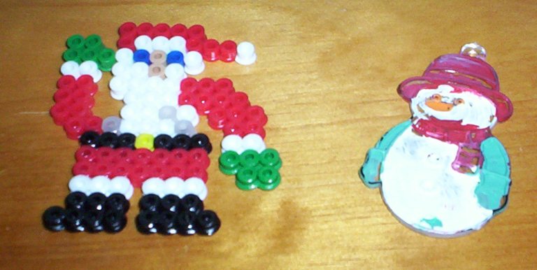 Here are two ornaments Noah made for me this year. Santa is made from beads that you place on a peg baord and then iron to set. It takes a lot of patience. The snowman is a painted suncatcher. I guess Noah takes after his Aunt Dawn.
