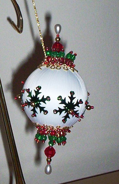This is one of those balls made by sticking pins through beads into styrofoam. They’re aren’t hard to do (except on the fingers) and the result is very fancy.