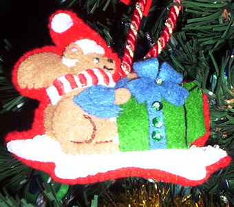 I made a Christmas tree skirt for my mother from a kit out of pieces of felt appliqued and then highlighted with embroidery and sequins. It was slow, painstaking work since I sewed each piece on (some people might glue them). The skirt was printed with design all the way around, so that you did the entire design twice, once on the front and again on the back.