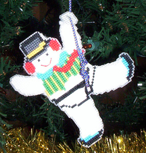I designed this myself the first year I was climbing. The basic snowman was from a book of cross stitch motifs. Then I added the harness, climbing shoes, rope and biner. I made one for myself and a couple for other climbing friends.