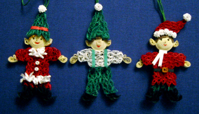 I found that I had to use bigger quills to duplicate her work. The elf on the left was made from 2″ quills which is what the book called for but that was making for tedious, cramped work. The other two are made from 3″ quills and I think the more open quality to the quills looks nicer for something like a Christmas ornament. Now that I’m using the needle tool instead of the slotted tool to roll my quills, they come out smaller overall. I haven’t been able to prevent that yet but using a longer piece of paper than called for seems like a good compromise for now.