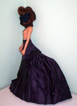 Here’s Lady Paradise modelling the underskirt. I’m not sure it ended up exactly the right shape. It’s made out of a million strips of ribbon. Kind of crazy. I think a pattern and some fabric might have been a better way to go. Their sewing instructions aren’t that clear and I ran out of ribbon before I got all the bows made. I don’t think I wasted any either but I came up about 20″ short which is a lot of ribbon.