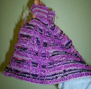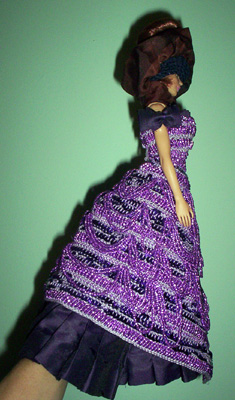 Nearly done. You see the bow on her shoulder? Well, there isn’t one on the other shoulder yet. There are also bows that go on the back and more beaded loops for the bodice and sleeves. Then there’s the hair to worry about. I guess I can’t just keep the scrunchy on. It’s starting to seem like crocheting the dress was the easy part.