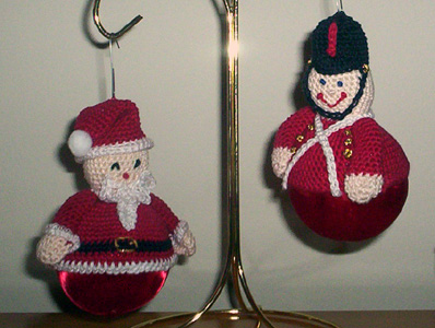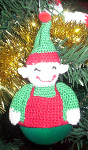 Three more ornament toppers crocheted with thread from a leaflet. I’ve also made the snowman. I think that elf’s a little demented looking.