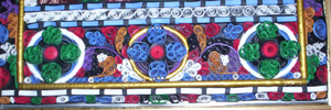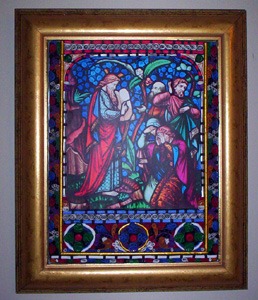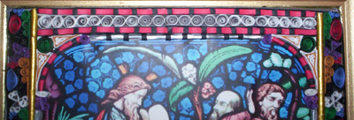 Becky from the Quillers group had a wonderful idea to quill a stained glass window. I thought my mother would like such a thing, so I searched the net for a photo of a stained glass window I liked and came up with Moses returns from Mount Sinai (1863). I printed the photo to a nice color printer and then quilled on top of it. I only quilled the framing around the figures because I decided that I didn’t have the skill to try to do more subtle things like the faces and gowns, but since the window had a natural frame it worked out very well.