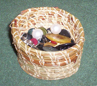 I’m using this to hold spare buttons. Isn’t it purty? My grandmother has given me a book of advanced patterns and I might try another basket if I can find a good source for the supplies.