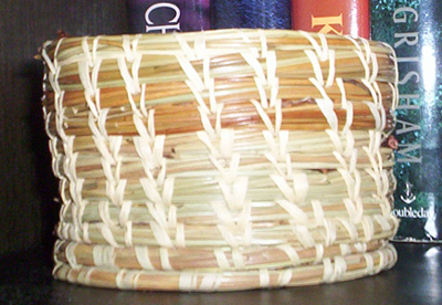 Remember in high school how “basket weaving” meant a gimme class? Maybe we should have tried it. I think basket weaving requires more hands than I have. This was made from a kit. I got better at it as I went around but you can see that my shaping efforts fall somewhat short or perfect symmetry. You need one hand for the sewing needle, one hand to hold the bunch of pine needles you’re weaving in, and the other hand to help shape the basket.