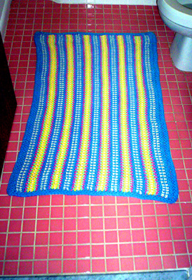 Does it look familiar? It’s the same pattern as the afghan I made for Steve below but in different colors and a cotton yarn. My old bathroom rug had faded to the point where it was basically white, although it started out in colors similar to these. As it faded, it also became very thin, which was a positive. My bathroom door doesn’t have a lot of clearance and my bathroom is very tiny (as you can see), so the rug has to be thin enough to fit under the door.
