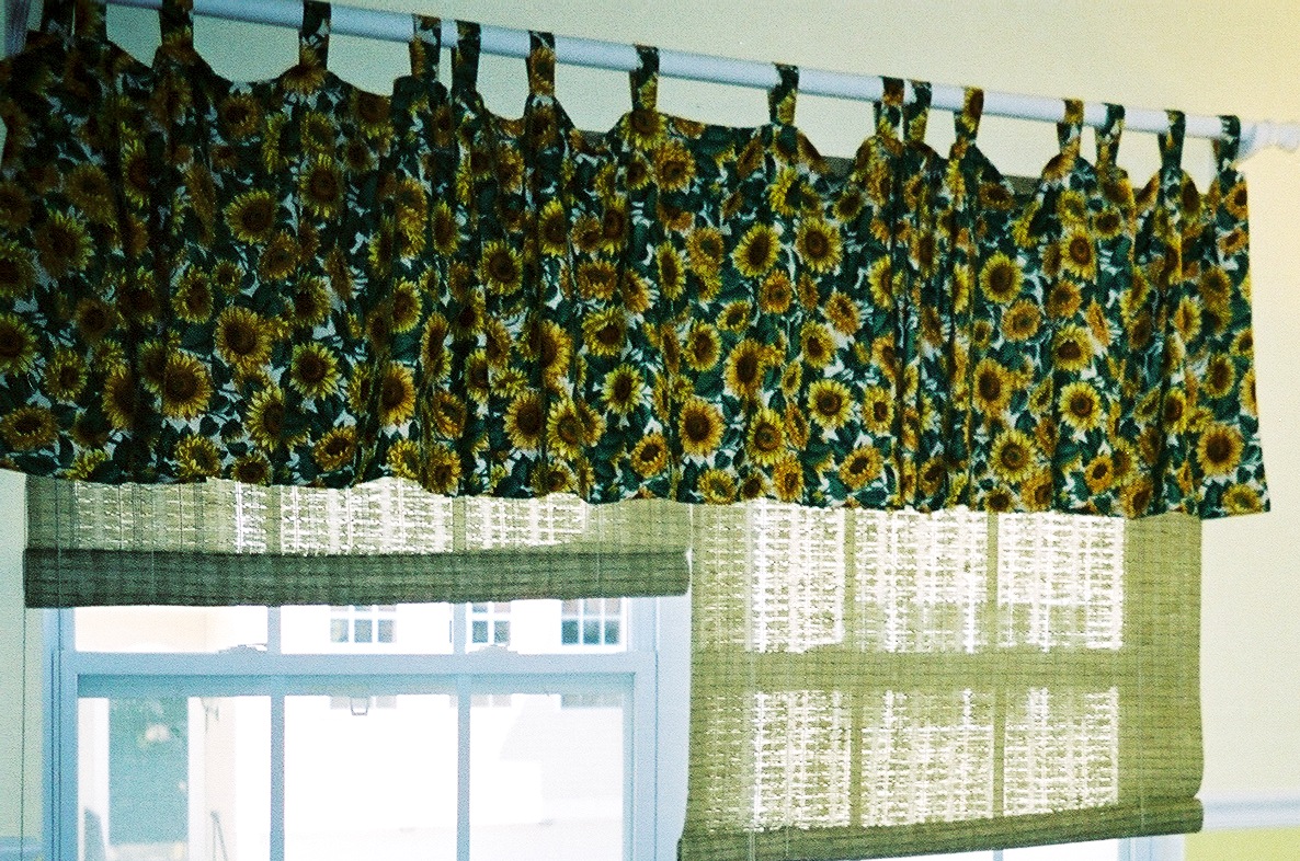 I made the pictured valance without a pattern from cheapy Wal-Mart fabric by simply folding the fabric in half, right sides together, and sewing along the sides. Then I made the tabs – what a pain to turn them all – pinned them inside the unsewn top and top-stitched. If I had it to do again, I’d probably make the valance shorter. The fabric shades came from Pier One.