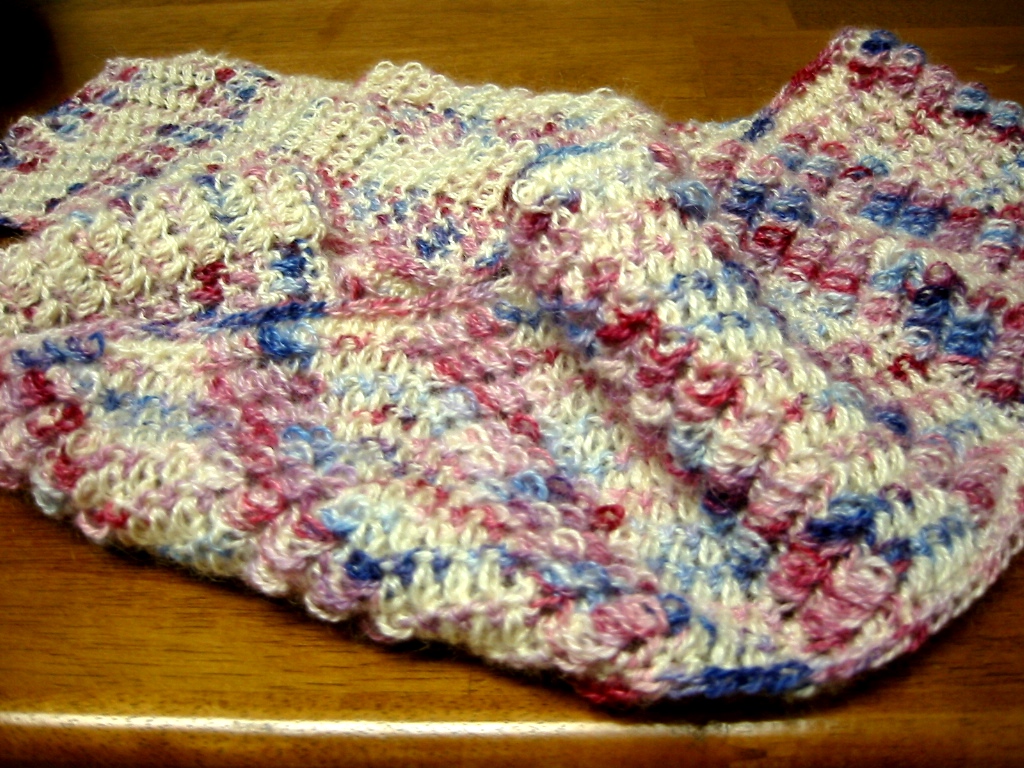 These scarves were made with the first four patterns in the booklet Special Stitches Scarves (not necessarily in that order). I’m especially fond of the bottom one. It’s a very pretty pattern and I love the yarn which is left over from an afghan I made for my boyfriend.