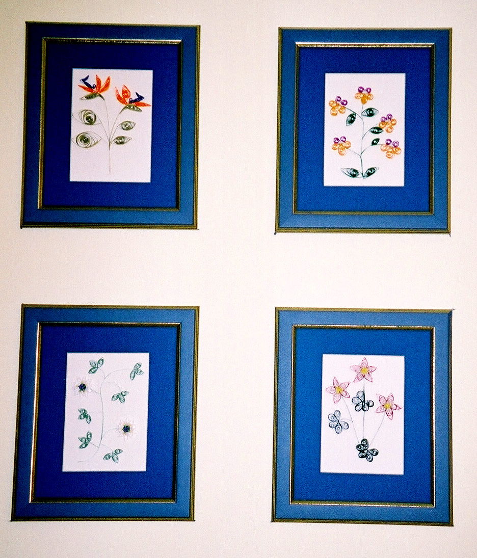 I made a series of four flowers from A Guide to Quilling Flowers and framed them in beautiful blue frabric frames from A. C. Moore. Although you can’t see the detail in these photos, the paper the flowers are mounted on is very pretty also – a sort of cream pinstripe. The current enthusiasm for scrap-booking means there are many interesting card stocks to choose from these days.