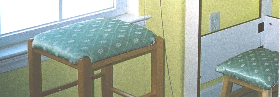 These stools (sitting stool and foot stool) were purchased at Target. They had hard wood tops. I covered them in batting and fabric from curtains I got at a tag sale for $1. I used the Trading Spaces method: fold and staple. The stools make sitting at my standing height craft/cutting table comfortable.
