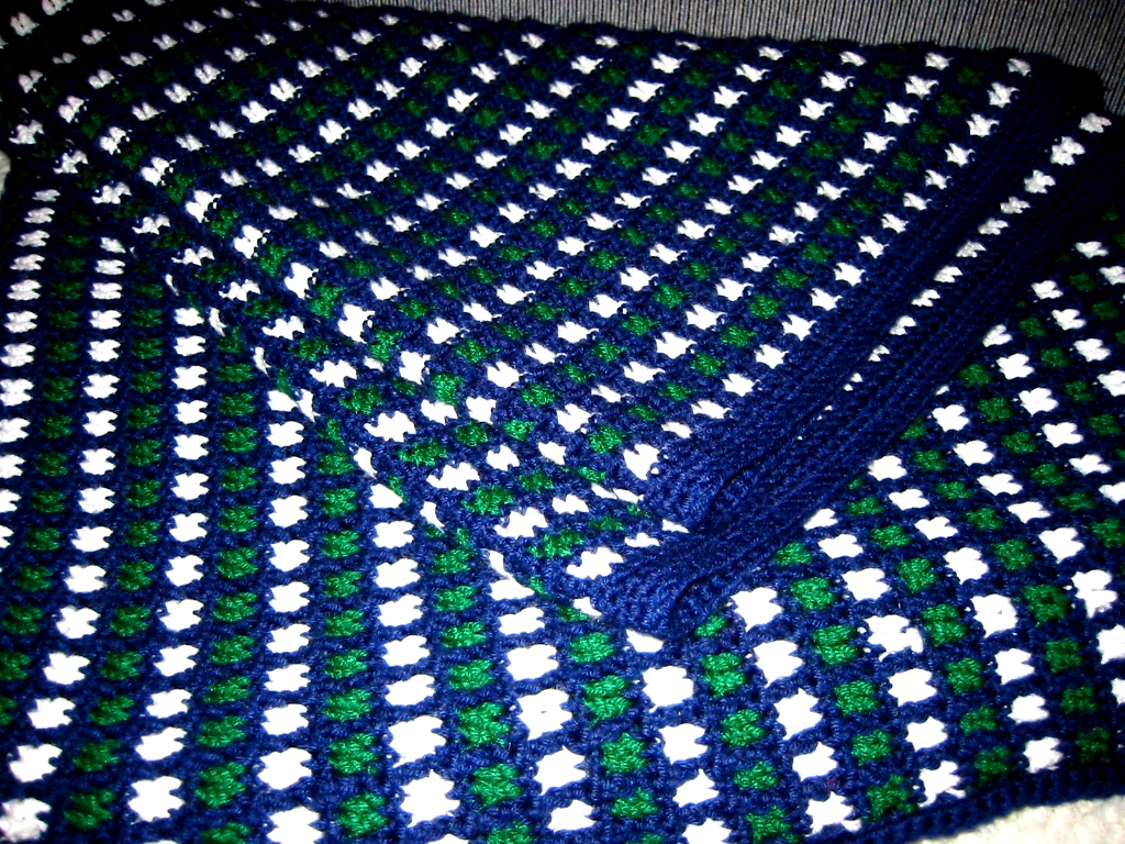 I used to have a freebie blanket in a blue/green/white tartan plaid from Microsoft. I liked the colors but it said “Microsoft” in one corner and it had gotten grungy and had a cigarette burn hole in it. When I quit smoking I decided to toss it and make myself a new blanket. This crochet pattern came from A Year of Afghans Book 5 which I’ve gotten several afghans out of. It’s the pattern called “Windowpane Wrap.” The pattern called for a very different color scheme with white as the dominant color and a series of pastels alternating for the underlying colors. I changed it to match my old blue/green/white scheme and am very happy with the result.