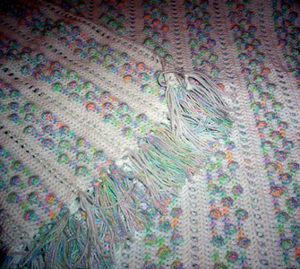 It’s hard to get a good picture of this yarn. The variegated yarn is somewhat lighter and more pastelly than it appears in the photo and it has a sparkle thread running through it. This is the second blanket I’ve made from Our Best Baby Afghans. It’s for my cousin Peter’s first baby.