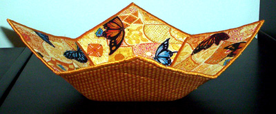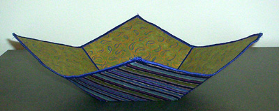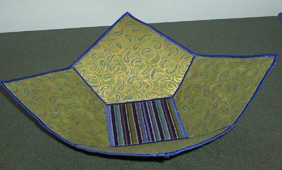 This one was a nightmare. First of all, it was made with canvas instead of the craft interfacing. That’s how to get the floppy corners. The book calls for two layers of canvas which I tried to fuse together but the fusing didn’t hold very well on the canvas so, as I was working, my textile sandwich (as she calls it) was coming apart in the middle. Also, the canvas shreds along the edges, so when I was doing the satin stitching around the top, I had to contend with strings of canvas everywhere and so the edge didn’t end up very smooth. On top of that, I was using this fancy gold thread as you can see. It didn’t like being wound on a bobbin very much and until I learned to lighten up the tension it kept breaking as I was sewing. Came out OK in the end though and I learned some things. The material doesn’t photograph very well because it’s shiny but it’s a beautifully elegant bowl.