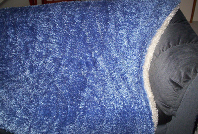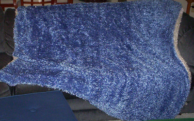 And after all that silence, I have a finished piece that took me about 15 minutes to make. But I love it and it was just what I wanted. Made from the new fun fur fleece, blue on one side and white on the other. It’s nothing more than two pieces of fabric sewn together but the resulting shapeless floppiness fits the fabric exactly. This is the best snuggling blanket ever made and I’ve got the best snuggler to share it with me (which has got a lot to do with how little I’ve been getting done).