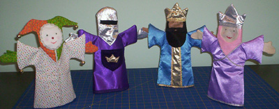 Here are the rest of the fairytale puppets – a king, a queen, a jester, and a knight. These were fun to make: choosing little scraps of interesting materials and trim.