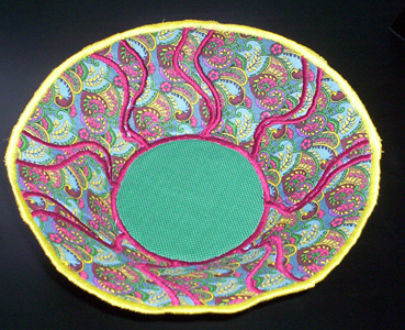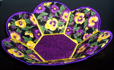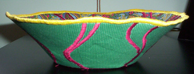 My machine has died. I guess it wasn’t meant to do so much satin stitching through so many layers of fabric. Here are the last three bowls it managed to turn out before biting the dust.