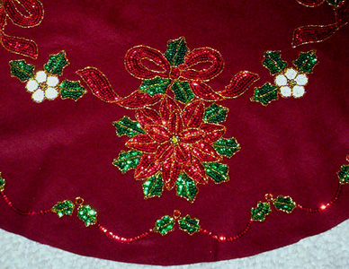 Finally! I bought this kit about four years ago. I didn’t have anyone to make it for (my mother made my own tree skirt) but it was so beautiful I couldn’t resist it. Then my friend Sheila’s tree skirt got ruined in a cat/tree accident and I started it for her. This was all year in the making but it was worth it.