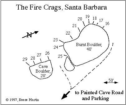 Fire Crags is a relatively new sport climbing area on large sandstone boulders above Highway 154 at Painted Cave Road near Santa Barbara. Access to these rocks was made possible after a fire burned off the impenetrable brush surrounding the rock. These routes get sun in the afternoon and are hot in the summer. Unfortunately, there was significant chipping and "alteration" of the rock by a fool. Hopefully, by exposing this stupidity, we can prevent further abortions from occurring. Chipping destroys our rock and steals climbs from the future. ![]() Route List 16. Europe Revised, 5.7. Two Bolts. 17. Tester, 5.9. Three bolts. 18. Short Shot, 5.7. Toprope out of cave. 19. Bent Brain, 5.8. Toprope route. 20. Jensen's Jugs, 5.10b. Four bolts. 21. Movin' Out, 5.11b. Five bolts, chipped holds. 22. Grib Dat Hole, 5.11a. Six bolts, chipped. 23. Finger Fit, 5.11b. Five bolts. Has been done without the drilled pockets (5.12). 24. Face the Seam, 5.10. Four bolts. 25. Black Crack, 5.9. Take a #3 Friend. 26. Quick Crank, 5.10+. Don't bother. 27. Screaming Knee Knee, 5.11c. Three bolts. 28. Flaccidily Flexing Forearms, 5.11d. Three bolts. Would have gone without the drilled pockets. 29. Crack It Up, 5.9. Long boulder problem. Directions From Santa Barbara take Highway 154 toward Santa Ynez; turn right at Painted Cave Road, and head up the road for about 1/2 mile to a hairpin turn with a pull-out on the left. Park here. A five minute walk along a traversing climbers trail leads to the boulders. Be sure to park completely off the pavement--you don' want a ticket do ya? References This information was first published in Issue #6 (May/June 1997) of mOthEr rOck magazine. Copyright (c) 1996-1999 Reese Martin. All rights reserved. Questions? Comments? Send E-mail to rsm@reesemartin.com. |